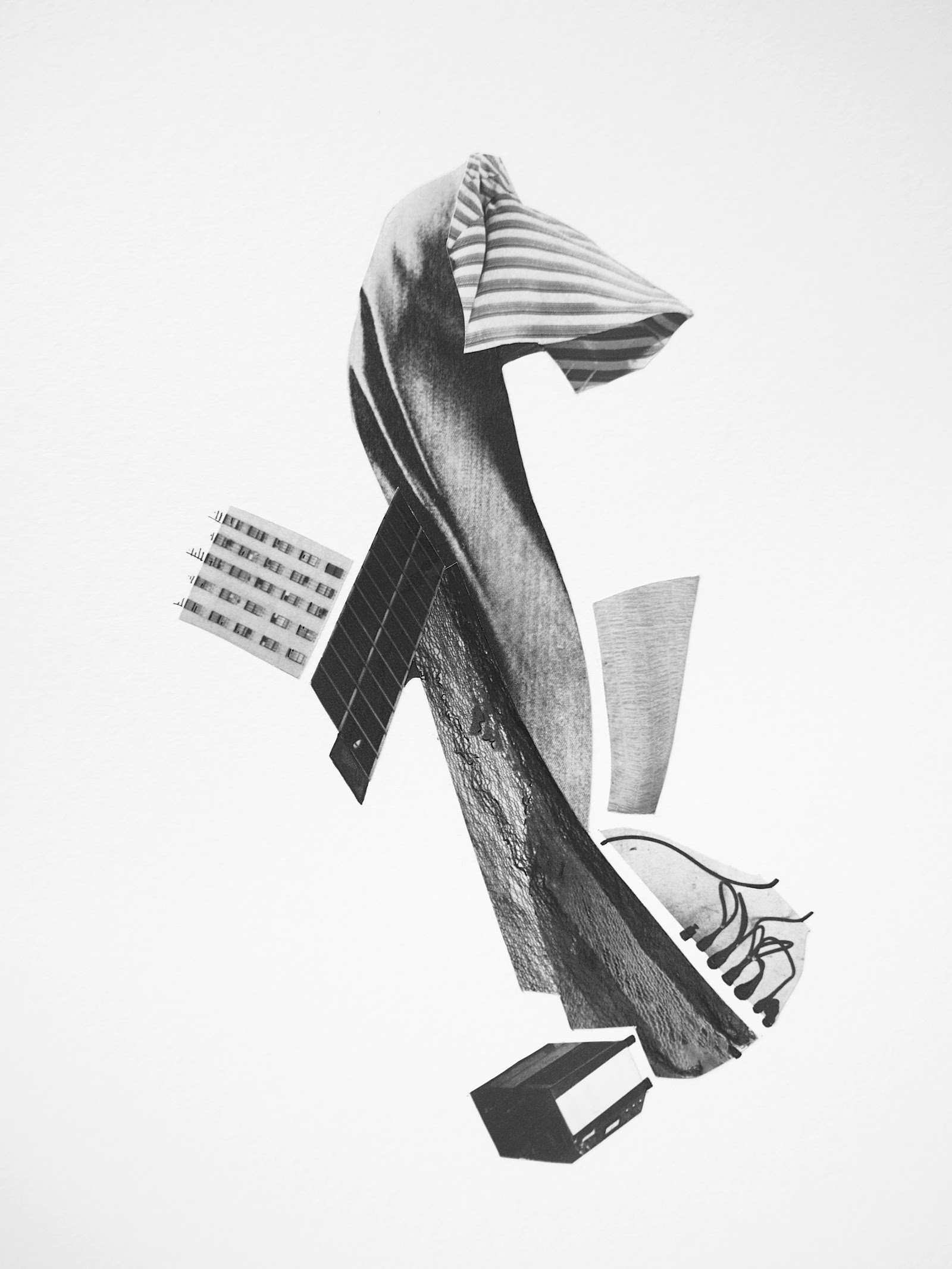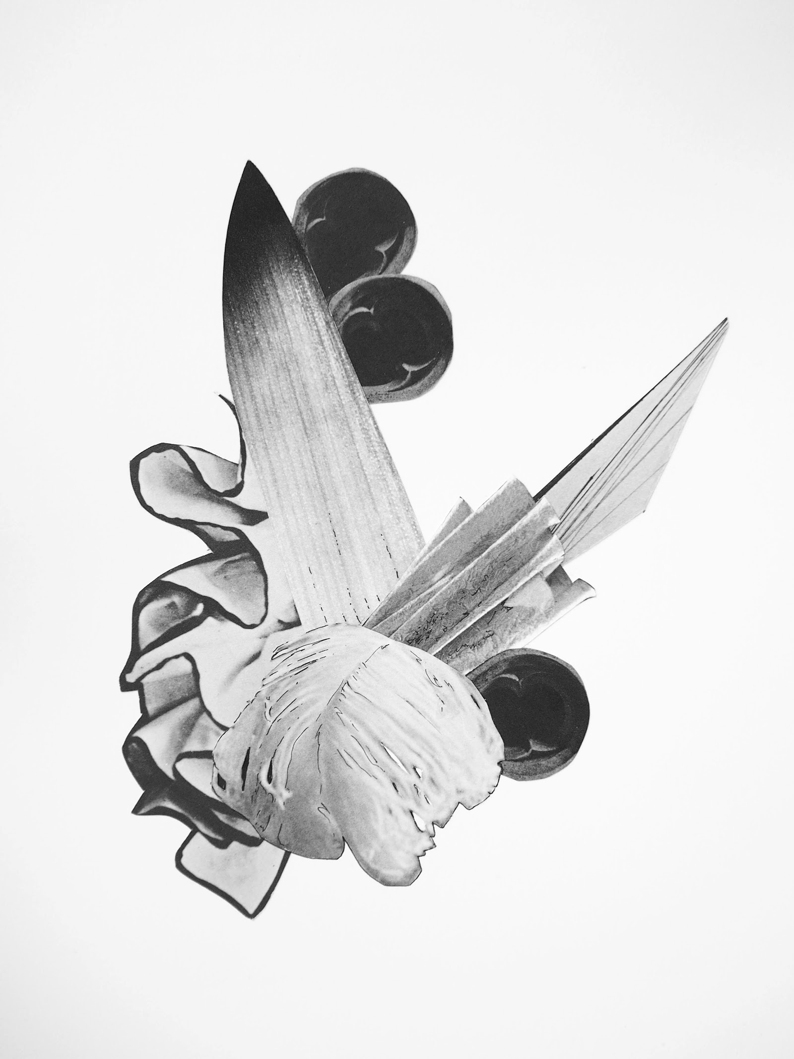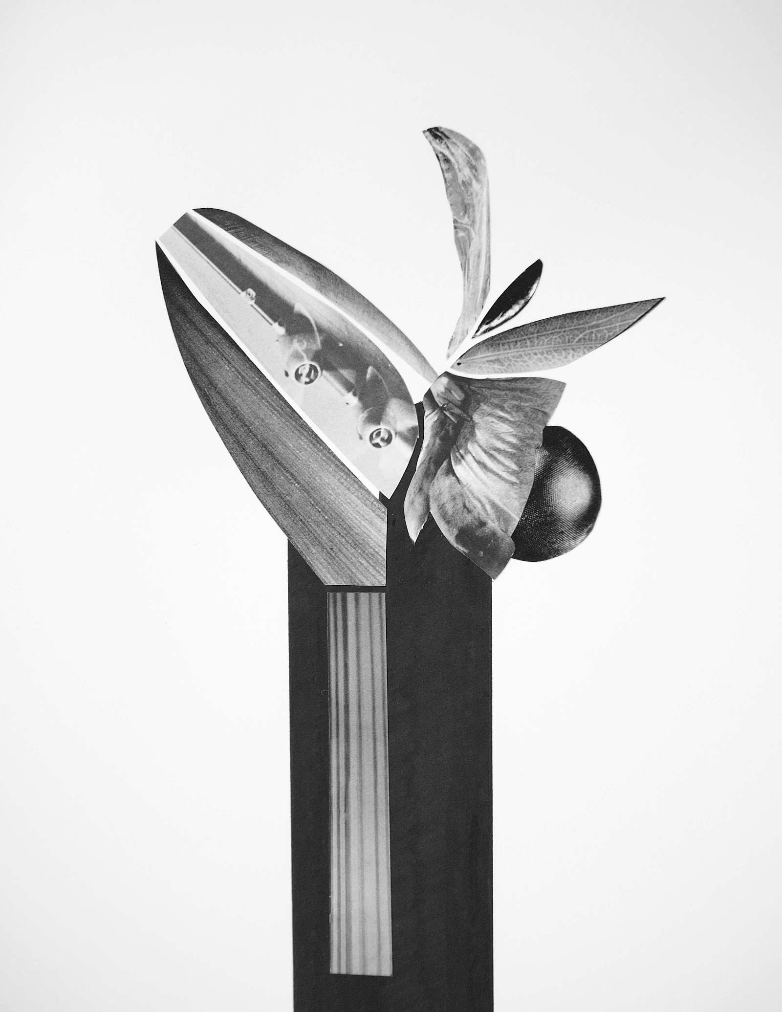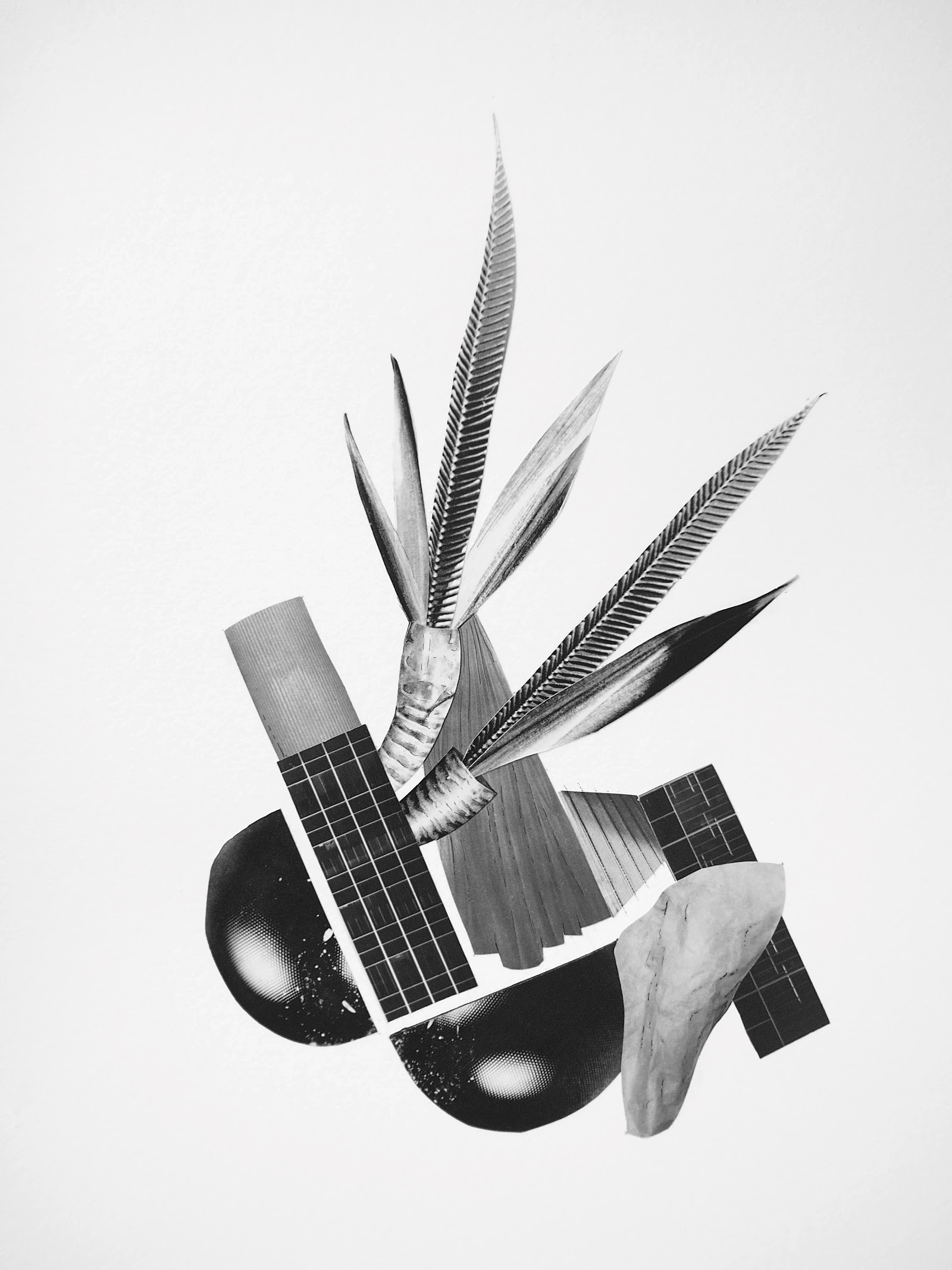 A series of monochrome collages combining architectural forms, textiles, and elements of the natural world. Each work explores the overlap between the engineered and the organic — the hard lines of infrastructure, defined by order and predictability, alongside the softness of plant life, textiles, and animal forms, which feel familiar and warm. These two systems exist in ongoing negotiation, mirroring the tension we live with every day, each competing for space and meaning.