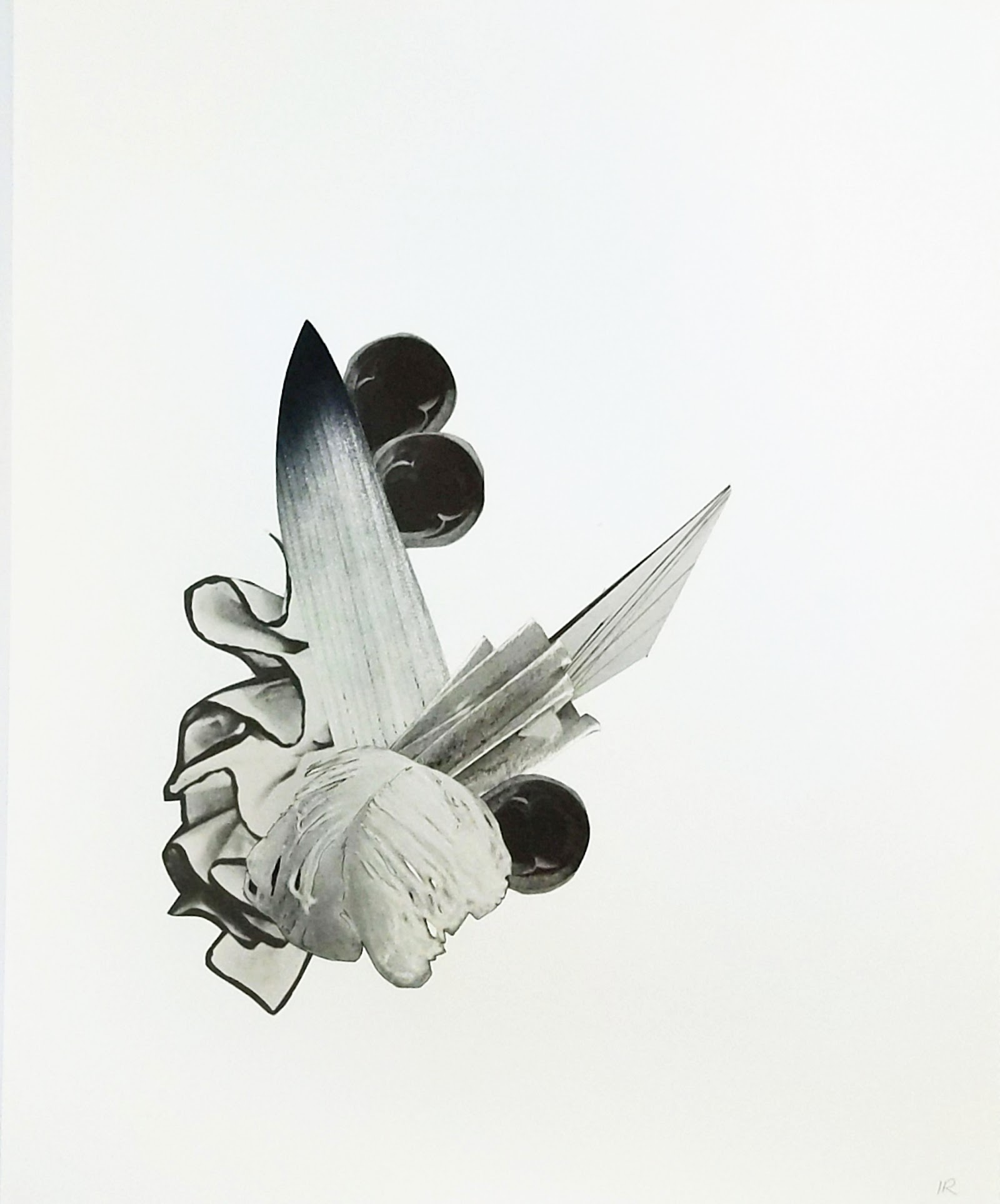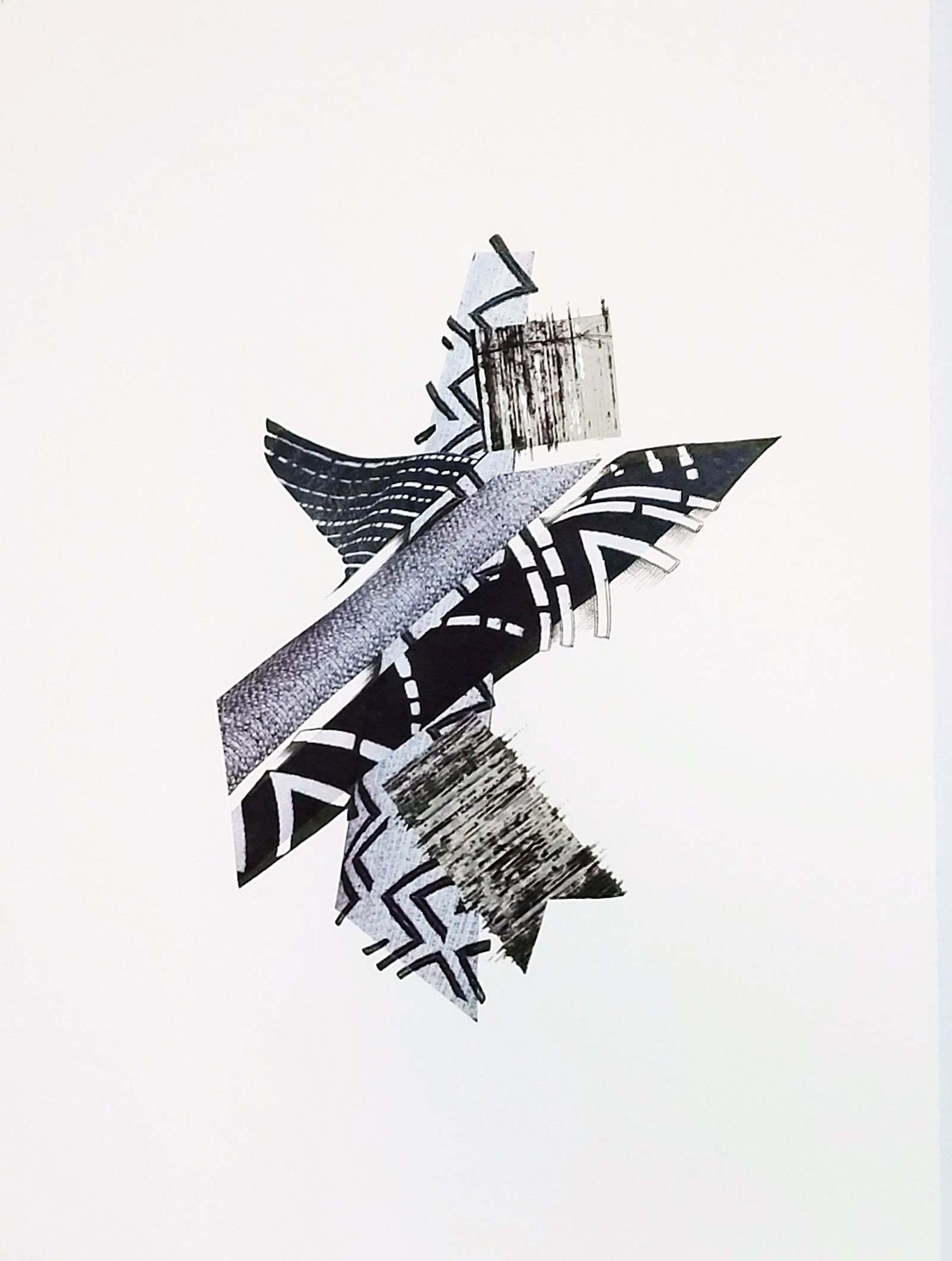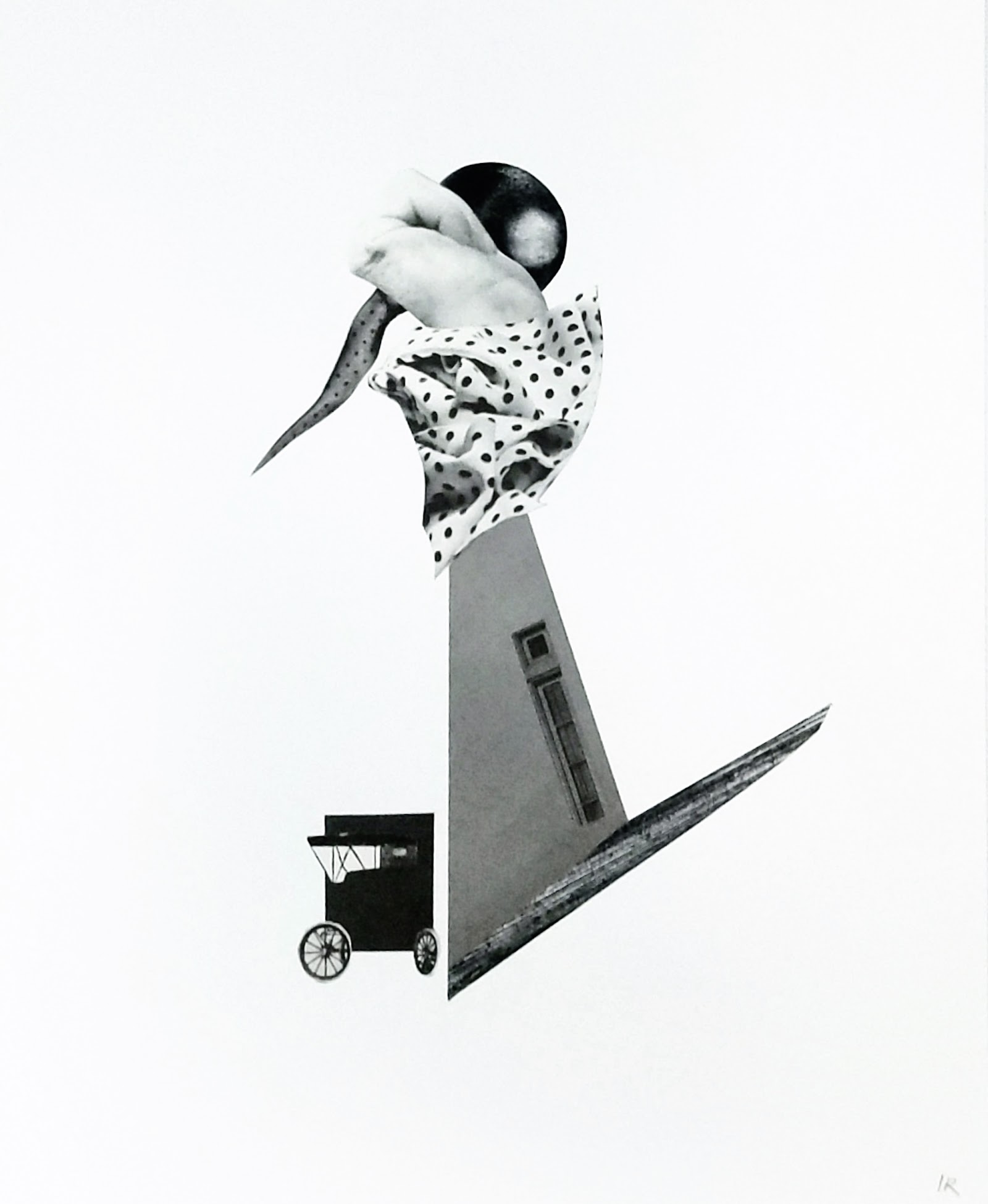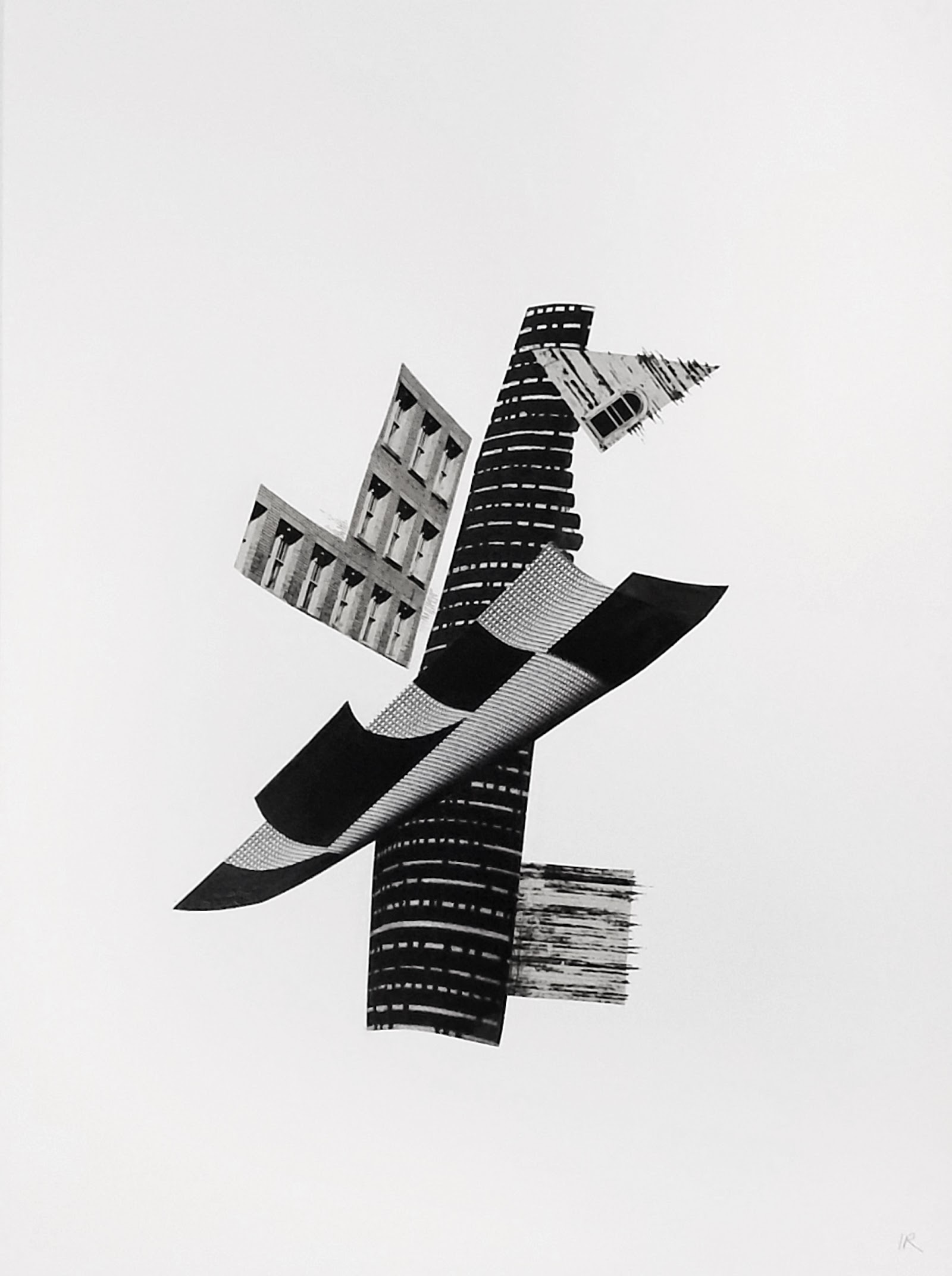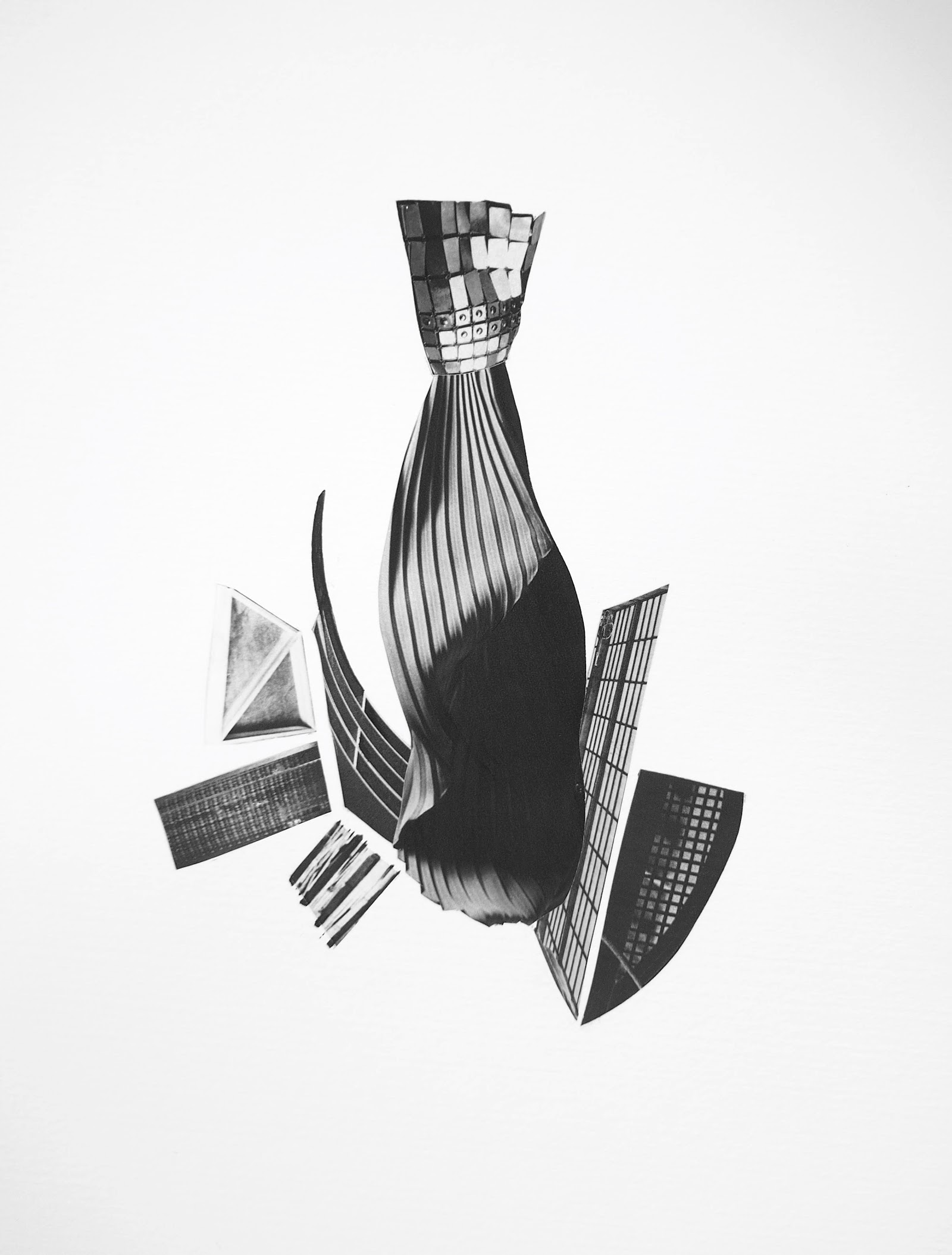 A series of monochrome collages combining architectural forms, textiles, and elements of the natural world. Each work explores the overlap between the engineered and the organic — the hard lines of infrastructure, defined by order and predictability, alongside the softness of plant life, textiles, and animal forms, which feel familiar and warm. These two systems exist in ongoing negotiation, mirroring the tension we live with every day, each competing for space and meaning.